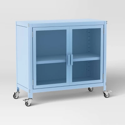 This 2-Door Metal Locker Cabinet from Room Essentials™ is perfect for your home office, study or living room. Supported by a powder-coated metal frame, this cabinet locker features an adjustable shelf to customize the interior space for different storage needs. It has two glass doors to easily identify inside contents, four castor wheels for quick portability, and anti-tip anchoring for enhanced safety and stability.
