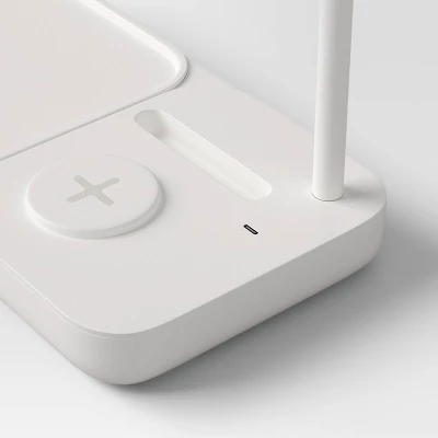 Elevate your study station or workspace with the Multifunctional Organizational Lamp with Tech from Room Essentials™. This table lamp features a cone-shaped shade with a rectangle base for a minimalist look, while the adjustable arm and head tilt help you adjust the lighting angle according. Plus, the base comes with a wireless charging pad and a DC power outlet to meet your everyday needs.